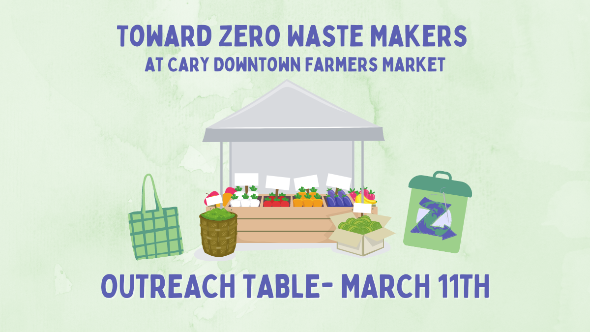 The Toward Zero Waste Makers will be hosting a table at the Cary Downtown Farmers Market (CDFM) on March 11th from 9a-12p to further our partnership with the market and raise awareness of the Reusable Bag Project. This project turns leftover and repurposed fabric into reusable bags which vendors at the CDFM hand out for free to customers who don’t have their own reusable bag, reducing the usage of plastic bags. The Makers group hosts a monthly sewing meetup on the 3rd Thursday in Cary to create new bags as well as kits for people who want to sew them at home.